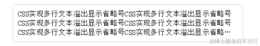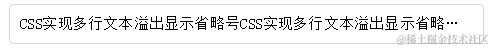 CSS实现单行、多行文本溢出显示省略号(…) 爱宇阳 2023-02-06 52 阅读1分钟 1.实现单行文本的溢出显示省略号 width: 100%; overflow: hidden; text-overflow: ellipsis; white-space: nowrap; 效果图: 2.多行文本溢出显示省略号 width: 100%; display: -webkit-box; -webkit-box-orient: vertical; -webkit-line-clamp: 3; overflow: hidden; 效果图: