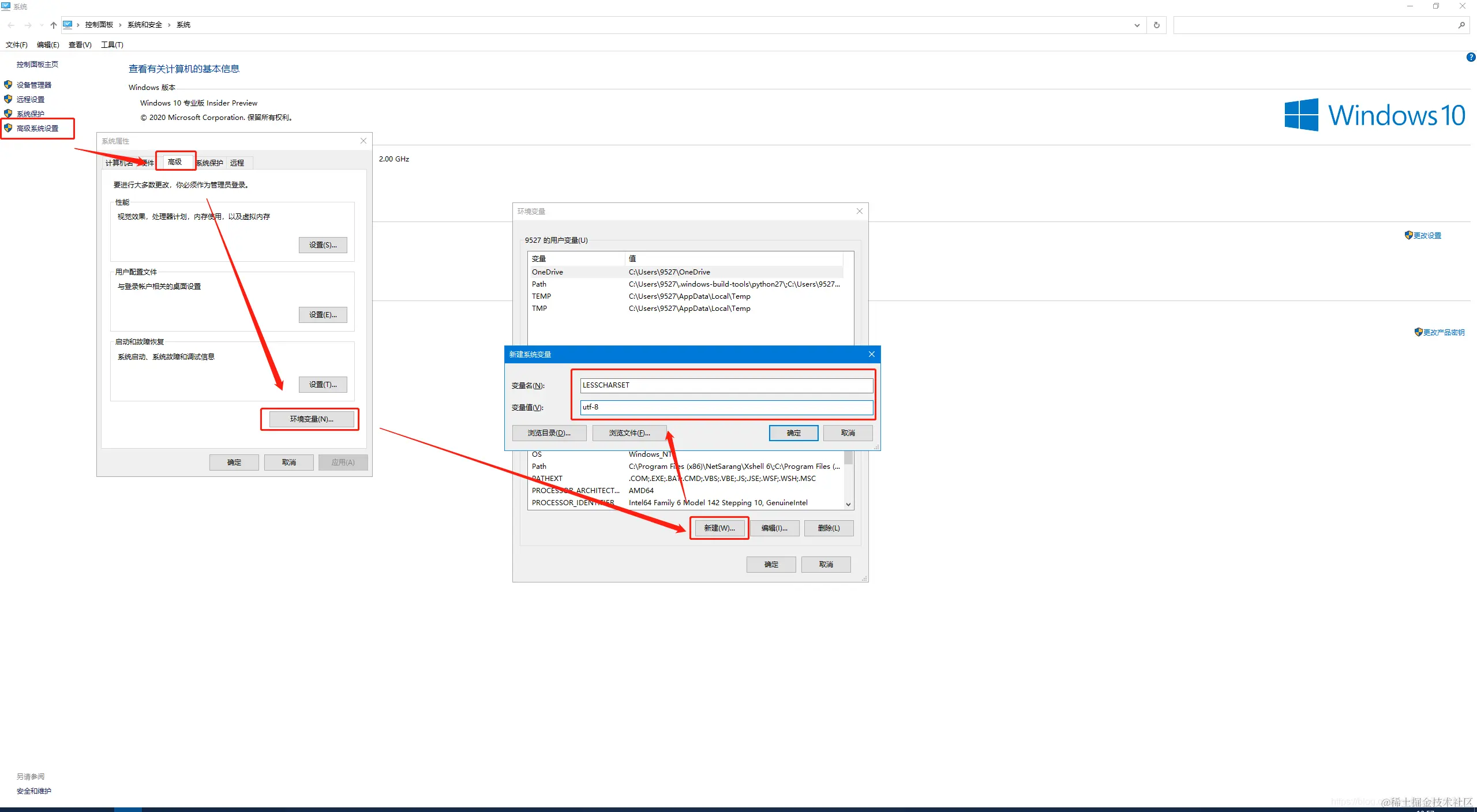 2、在系统环境变量中添加变量 LESSCHARSET 为utf-8