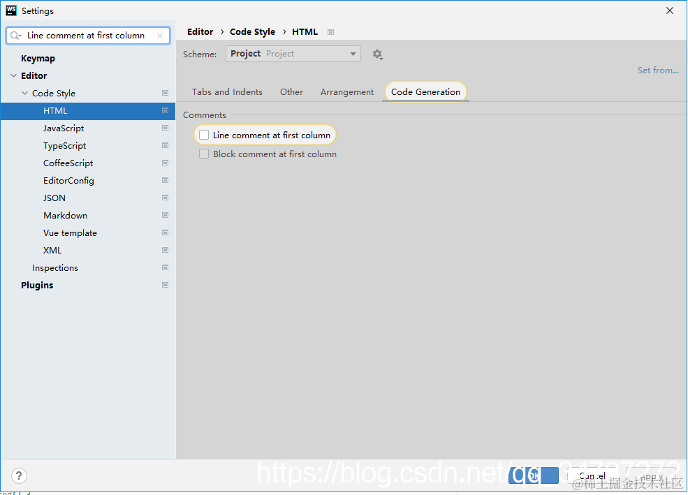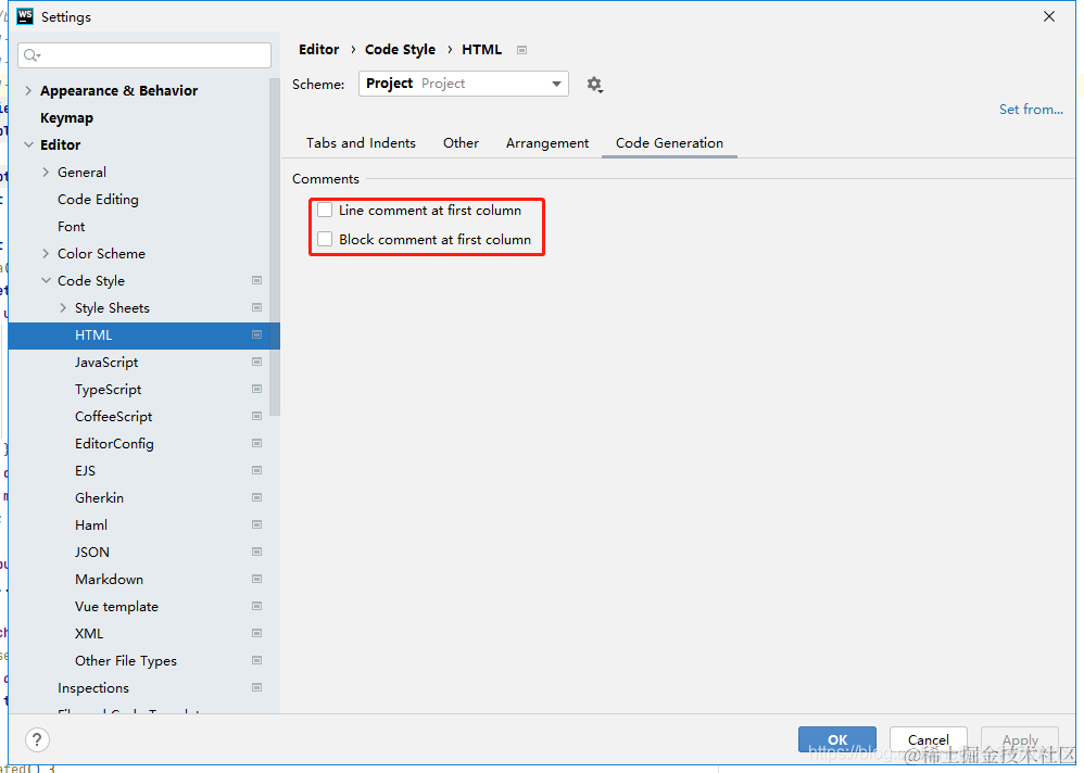 IDEA中注释的缩进(避免添加注释自动到行首) 爱宇阳 2023-02-06 284 阅读1分钟 以 WebStrom 为例,依次打开 Settings -- Editor -- Code Style -- HTML -- Code Generation,取消 Line comment at first column (行)、Block comment at first column(块) 选择 -- OK 也可以直接搜索 Line comment at first column 或者 Block comment at first column