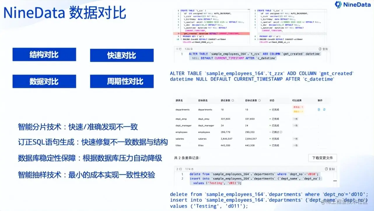 这些场景都可以使用”NineData数据对比”去解。它有几个大的功能模块,包括结构对比、全数据量对比,另外它可以支持快速对比和周期性对比等。