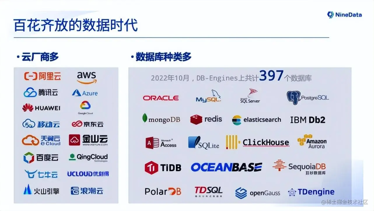 说“卷”并不合适,充分地竞争是可以给开发者/企业带来实惠的,当下的数字化也只是开始,潜力还巨大,所以,这里用了“百花齐放”来形容当下的数据时代。这里用两个“多”来具象化“百花齐放”这四个字。首先是云厂商多,这里简单罗列了一下,就有十六家厂商之多。另外,数据库也非常多,而且似乎还在变得更多。这里取了DB-Engines上10月份最新的数据,该网站十月份一共统计了397个数据库,这里列举了其中的15到20个,一部分是全球流行度最高的数据库,一部分是出现在DB-Engines榜单中的部分国产数据库。