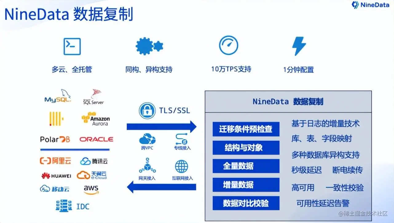 NineData 的数据复制产品,它是一个多云全托管的服务,支持阿里云、腾讯云等国内外主流的云厂商。另外,这是一个全托管服务,只需做一些简单的配置,就能拥有一个非常好的、长期稳定运行的数据复制链路。NineData同时支持同构和异构复制,不管是MySQL到MySQL,还是MySQL到可ClickHouse,都可以支持得非常好。另外,它的性能也非常好,TPS可以支持到10万,可以满足企业绝大多数在线的数据复制诉求。下面这个架构图,就是数据复制所具备的主要的产品能力,包括迁移时预检查、结构和对象迁移,全量数据迁移,增量数据迁移,以及在整个数据完成复制之后,支持对两端数据的对比和校验。