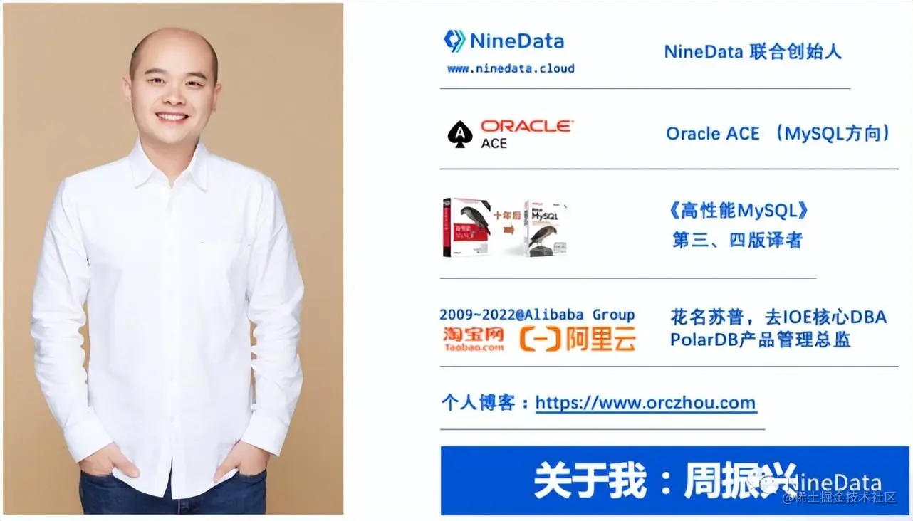 周振兴,是 NineData (https://www.ninedata.cloud/) 的联合创始人,致力于解决云时代的数据管理挑战。周振兴是数据库领域的一名老兵了,是Oracle ACE(MySQL方向),也是《高性能MySQL》第三、四版的译者。2009年,加入了阿里数据库团队,在这个团队供职12年,是阿里数据库架构演进的核心人员,从早期的去IOE,再到全面分布式支持历届的双十一。之后,则在阿里云上将集团的数据库技术全面云化,服务更多云端客户。