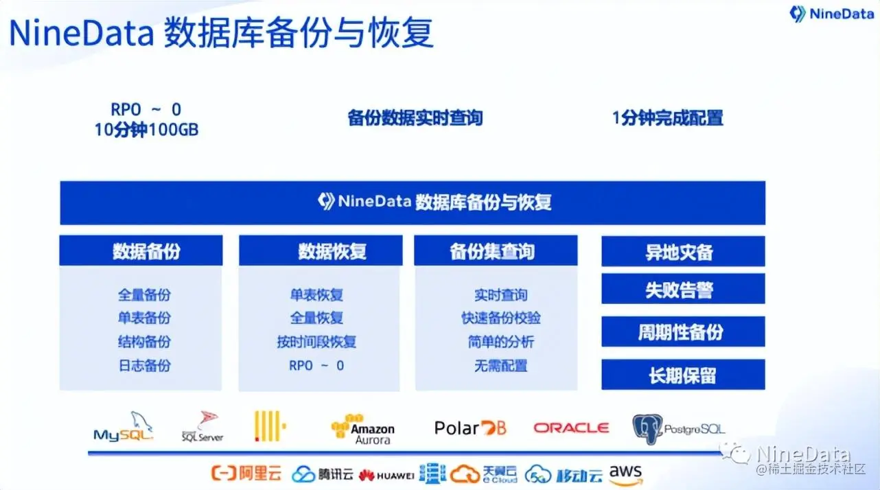 我们看一下NineData如何解决这些问题。首先,它的配置非常简单,是一个SaaS化的服务,一分钟就可以完成整个的备份任务配置。第二,它可以达到RPO几乎等于零的效果。另外,它的备份性能也会非常高,10分钟可以完成100GB备份,可以满足绝大多数线上备份的诉求。另外我们还提供了超越业界所有的产品,并且非常实用的功能,就是对数据备份的实时查询。也就是说,在备份完成后,就立刻可以查询到备份中的数据,不需要去做恢复。这样就可以很好地去验证备份的有效性。第二,当数据发生故障的时候,也不需要花费非常长的时间,先去做数据恢复,就可以直接对历史的数据进行查询和恢复。