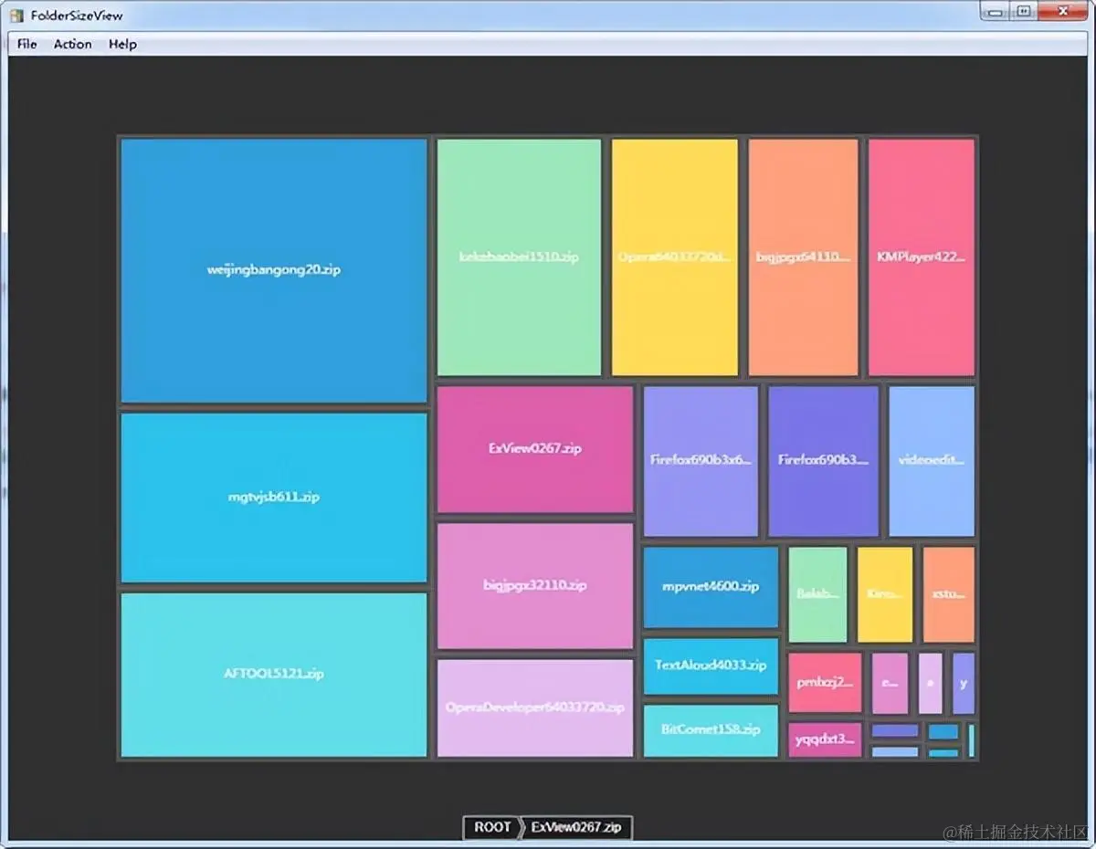 Folder Size View是一款通过方格展示文件夹内容大小的小工具,俗称矩形树布局,还会通过不同颜色区分不同类型的文件。这是一款相当简单、实用的小工具。只需要在运行后,将想要查看的文件夹直接拖动到上面,Folder Size View 就会开始帮你扫描了。很快磁盘占用越大的文件会以较大的块显示出来,同一个类型的文件,颜色相同。