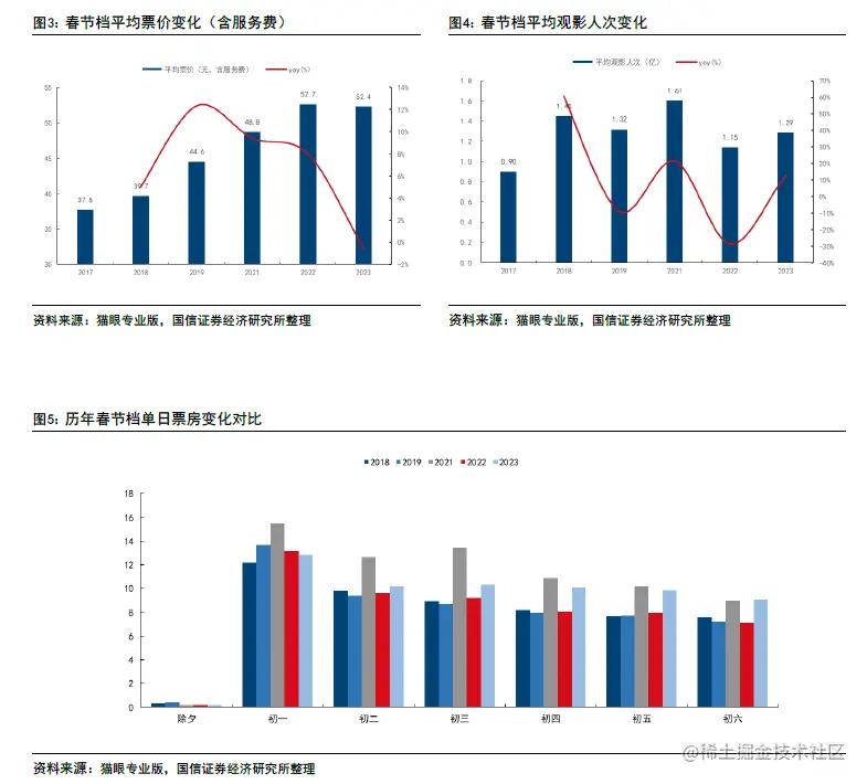 疫后放开春节档票房录得影史第二高。2023 年中国春节档票房取得62.05亿(不含服务费),同比增加12.47%,录得中国春节档影史第二高,本届春节档单日票房呈现后劲十足的特征,疫后观影人次提升是票房上行的短期要素,而相比2019 年,驱动票房增长的核心要素仍然是票价。