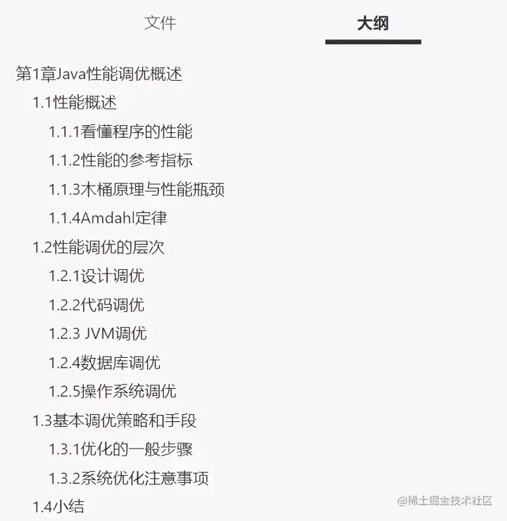 第1章,Java性能调优概述: 建立两个标准。一个是性能调优标准,告诉你可以通过哪些参数去衡量系统性能;另一个是调优过程标准,带你了解通过哪些严格的调优策略,我们可以排查性能问题,从而解决问题。