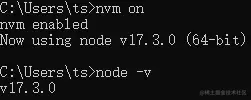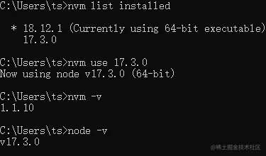 首先使用node list installed命令查看已经安装的版本,然后使用命令nvm use命令切换Node.js版本为17,然后在查看node的版本发现切换为17
