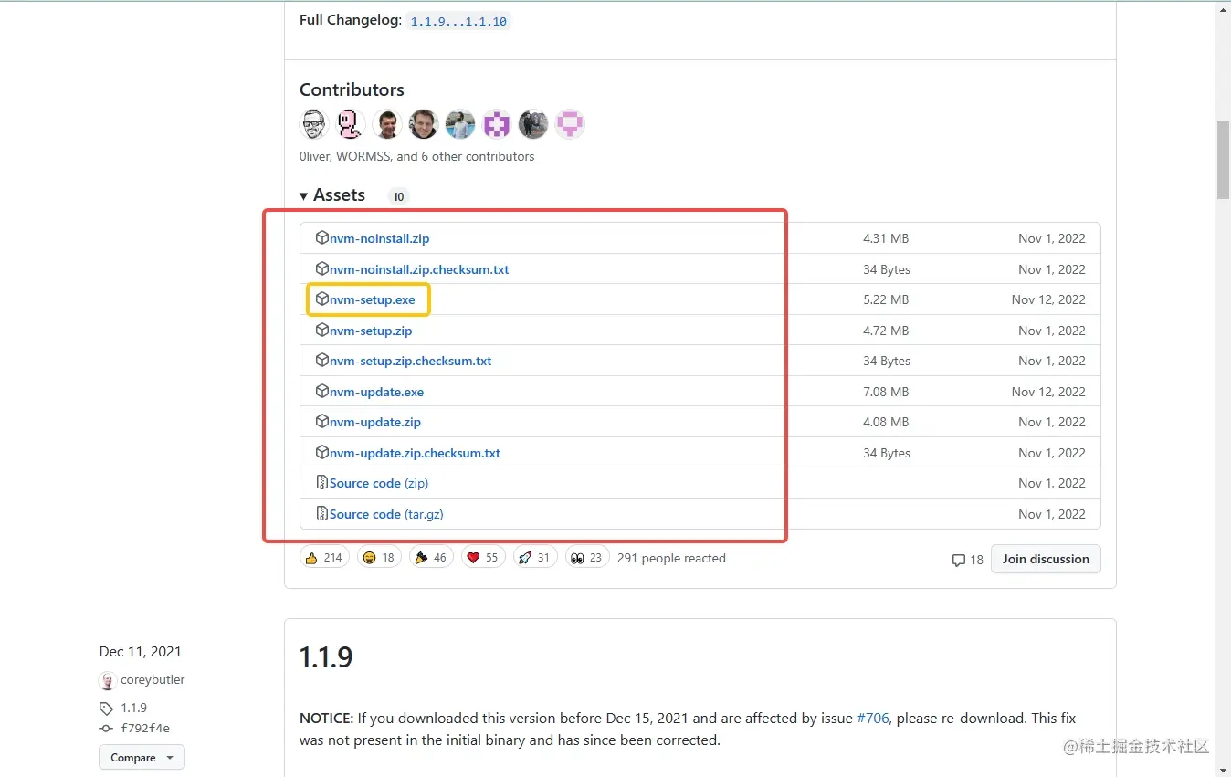 需要下载黄色方框圈中的nvm-setup.exe或者nvm-setup.zip,安装包形式的不用配置环境就可以使用。