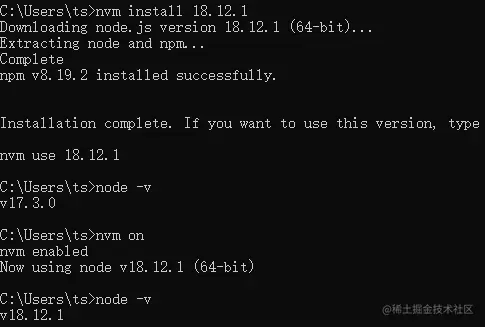 这时候我们再下载原来的Node.js版本:18.12.1,使用nvm install命令安装18版本的Node.js。这时候我们使用node -v查看node版本发现还是17,这是因为没有使用node on命令使配置生效,使用node on命令之后我们在查看Node.js版本发现已经切换到18了。