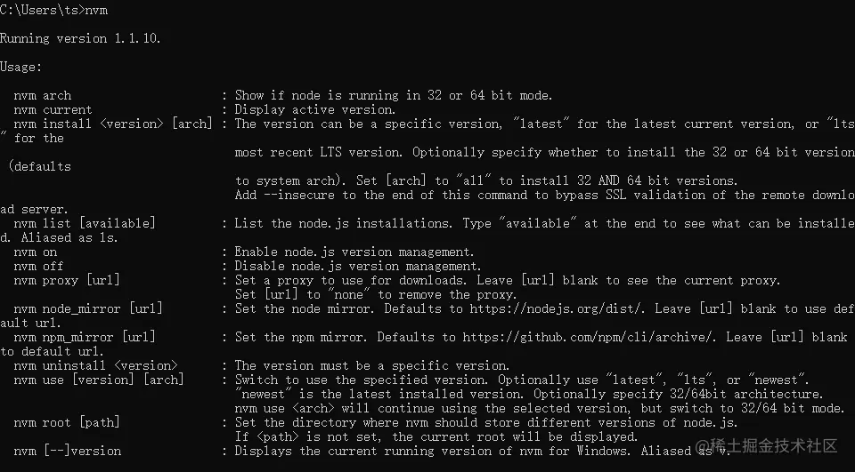 直接一路next直到安装。控制台输入nvm,出现以下界面则表示安装成功。