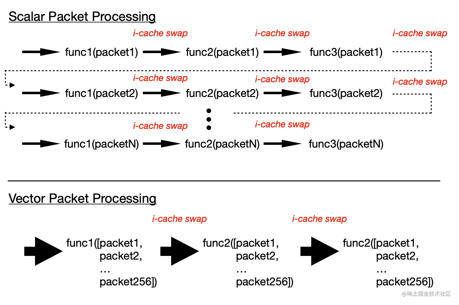 标量处理模型在性能上不如向量处理模型的另一个原因,就是在不同处理函数(业务逻辑)之间,报文传递到下一个处理函数的方式上有所不同。前者只是简单地用 pointer assignment 的方法来传递,若处理基于不同批次的情况下,由于低效的 pointer assignment,会导致处理一批报文时性能低下。