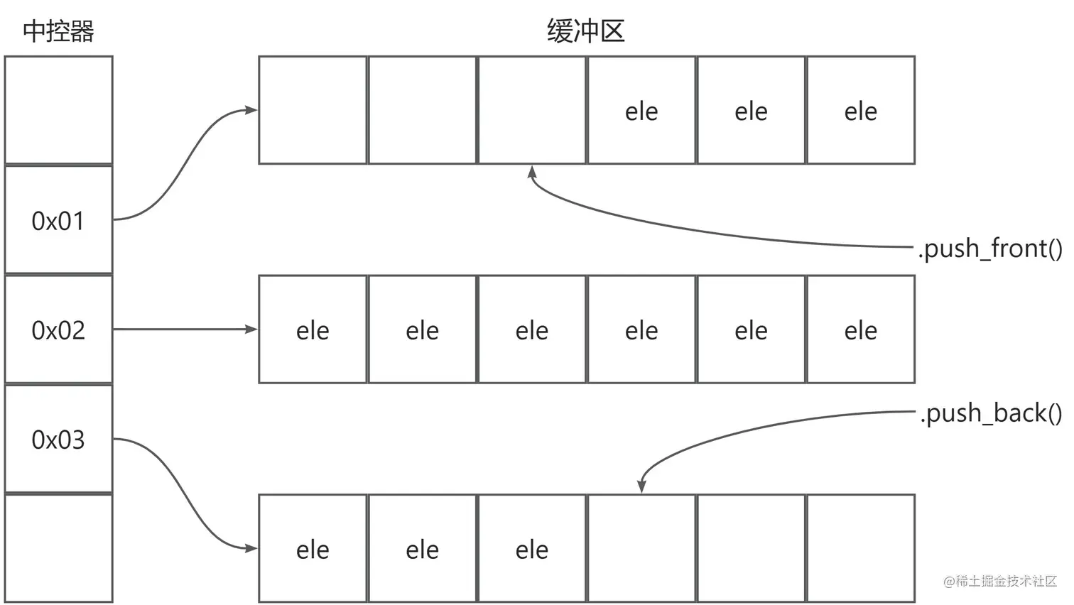 - 中控器维护的是每个缓冲区的地址,使得使用deque时像一片连续的内存空间