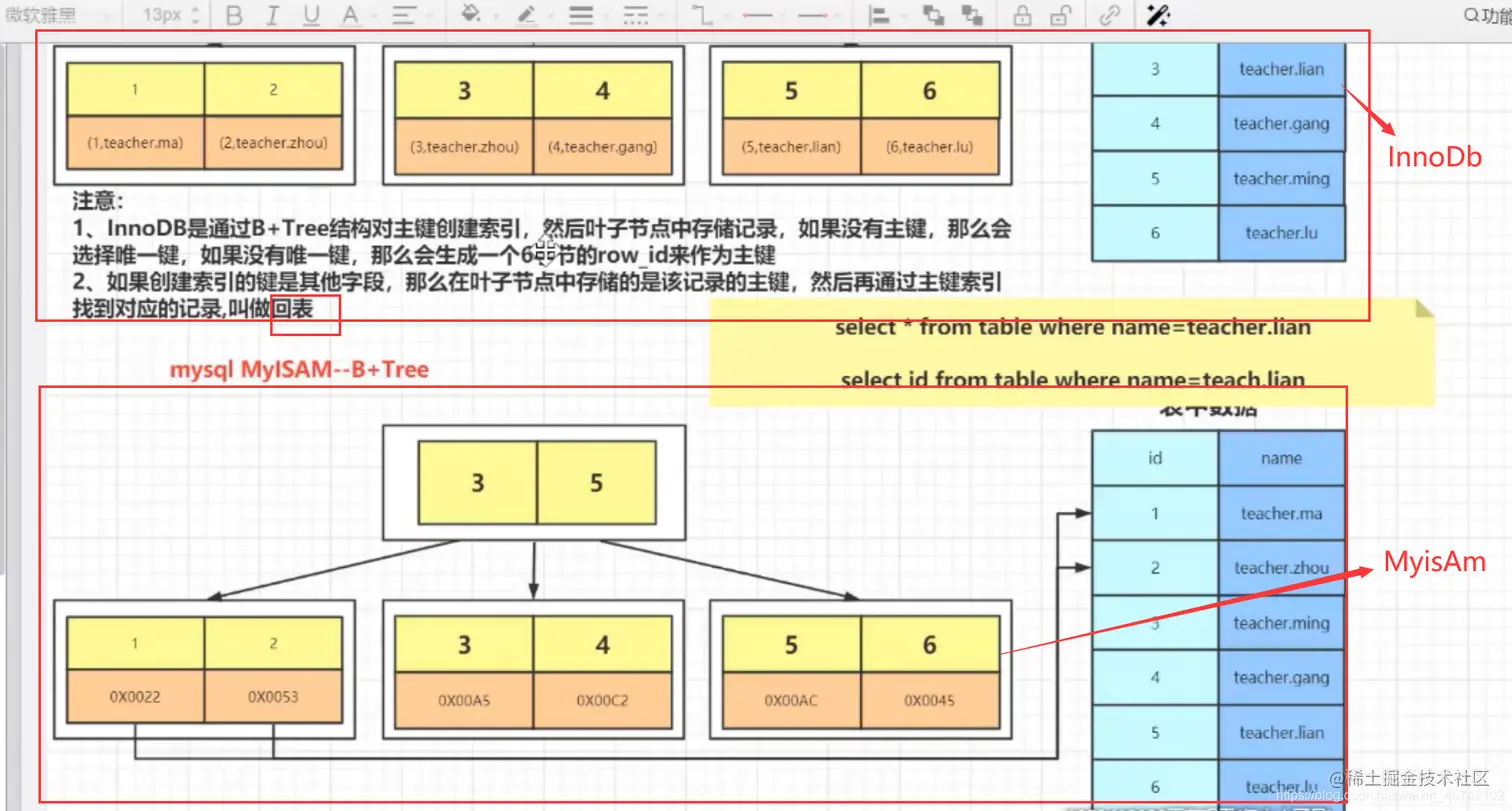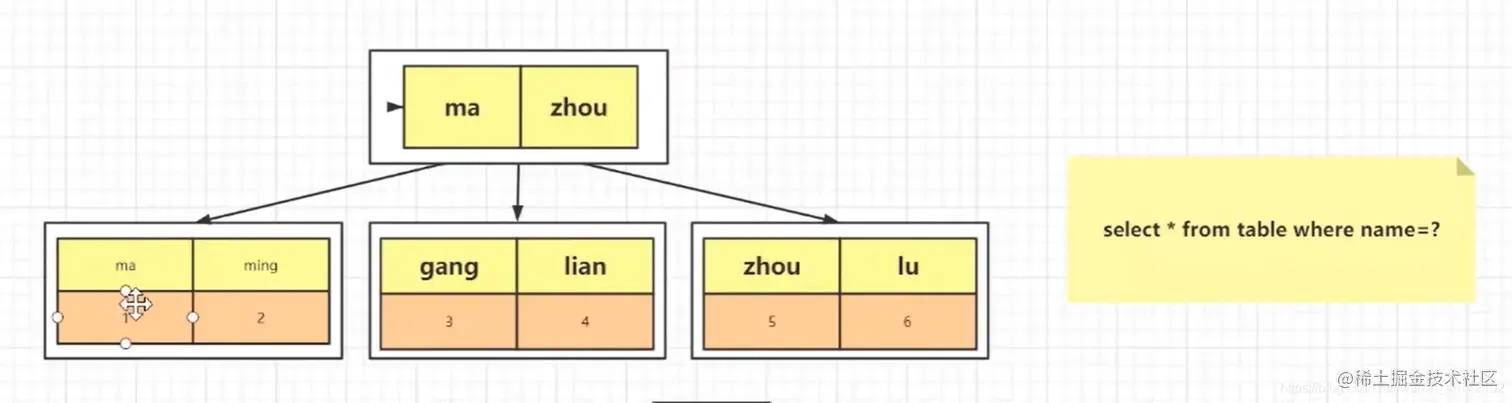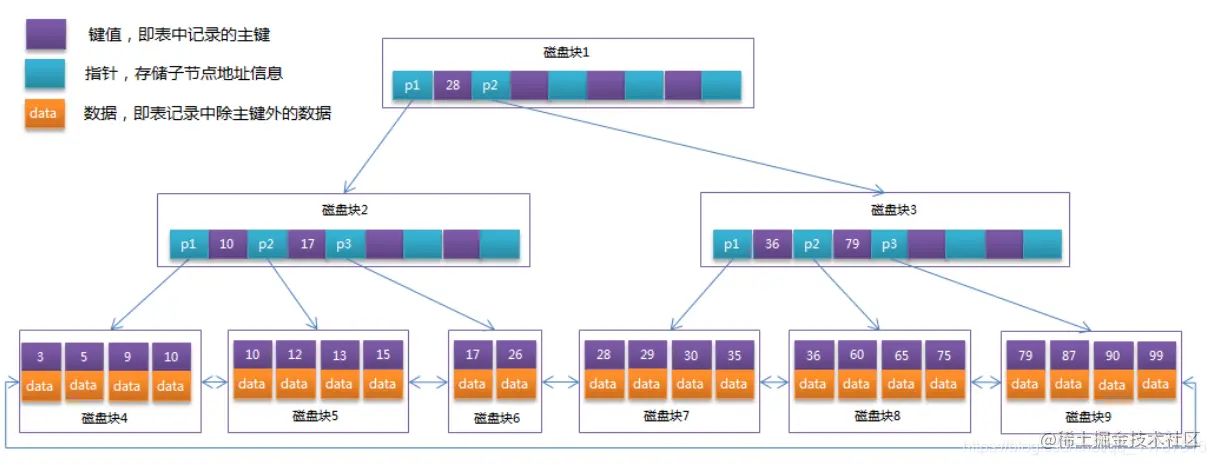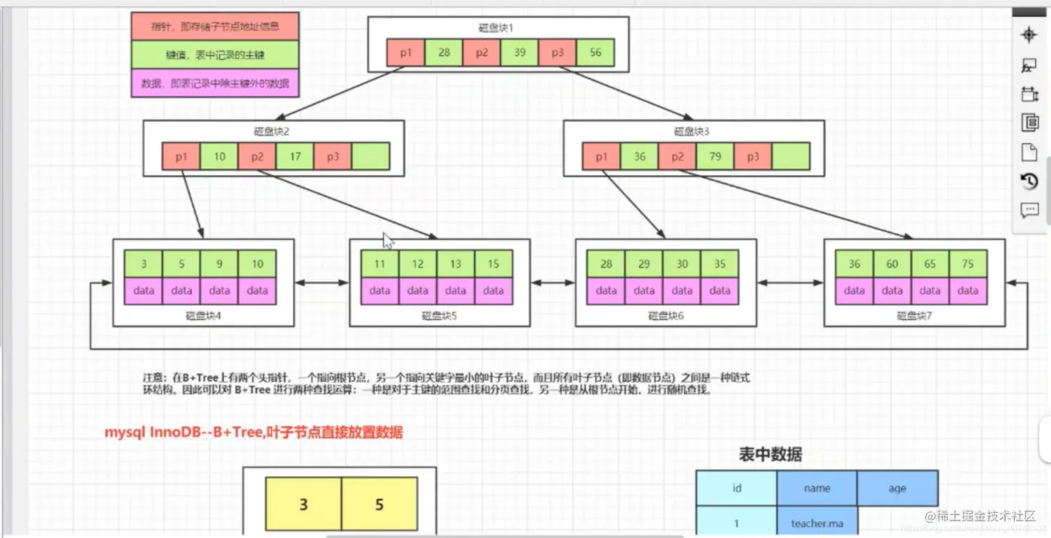 1、每一个节点,包含指针(指向子节点的指针),主键值,data(主键值所在记录的一行数据)。