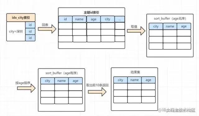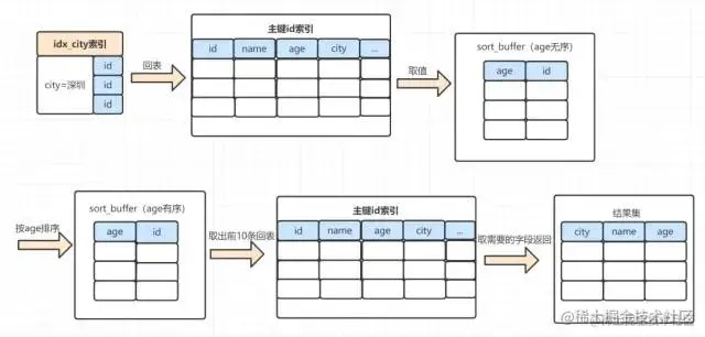 - 遍历排序结果,取前10行,并按照id的值回到原表中,取出city、name 和 age三个字段返回给客户端。