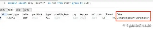 - Extra 这个字段的Using temporary表示在执行分组的时候使用了临时表