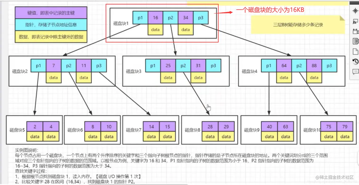 以上过程三次磁盘IO(实际上应该是两次),三次内存比较。每个节点都包含data(记录数据)