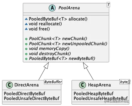 - PoolArena给allocator返回的是PooledByteBuf类,但是在实际的newChunk中操作的是一个泛型。这个泛型对direct堆外模式来说是一个nio中的ByteBuffer,对heap堆内模式来说时一个byte[]数组。