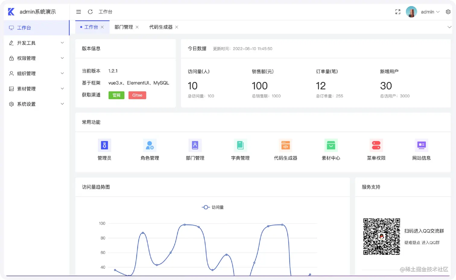 likeadmin是基于Vue3、elementPIus、结合PHP、Java、Python、Go等多主流语言搭建,集成用户权限、代码生成器、表单设计、岗位部门、云存储、素材中心、微信配置、Apl模块等一系列开箱即用功能,自适应手机、平板、电脑端等更多特性持续集成中.....