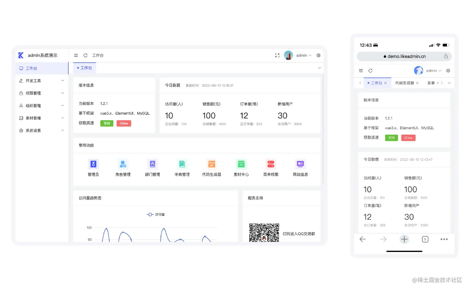 likeadmin支持手机、平板、电脑访问。通过自适应,完美解决移动端的管理需求,一套后台多端应用。
