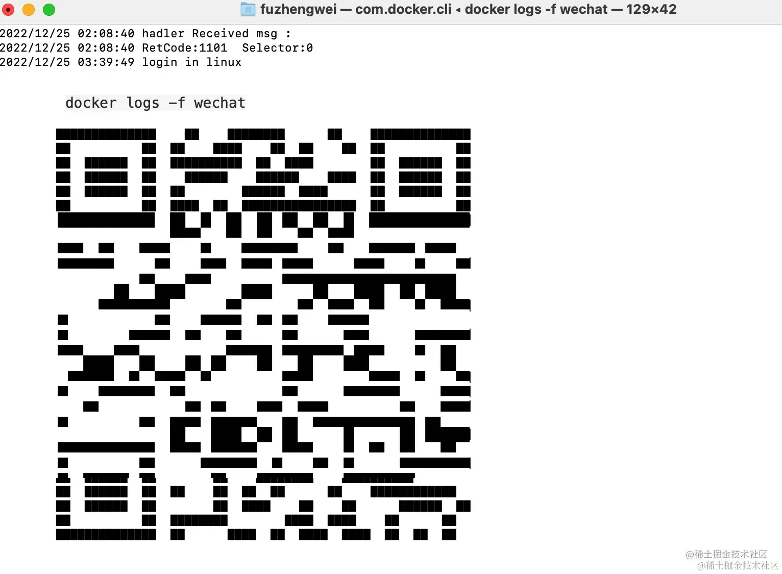 - 当你启动 cynen/wechat 运行 docker logs -f wechat 就可以看到弹出一个微信的扫码登录。这个时候你可以用自己的一个微信扫码登录,登录完成后你可以与这个微信聊天或者拉群里就可以了。