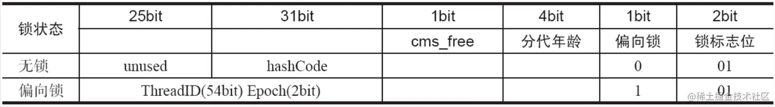 - 无锁 :对象头开辟 25bit 的空间用来存储对象的 hashcode ,4bit 用于存放对象分代年龄,1bit 用来存放是否偏向锁的标识位,2bit 用来存放锁标识位为01。