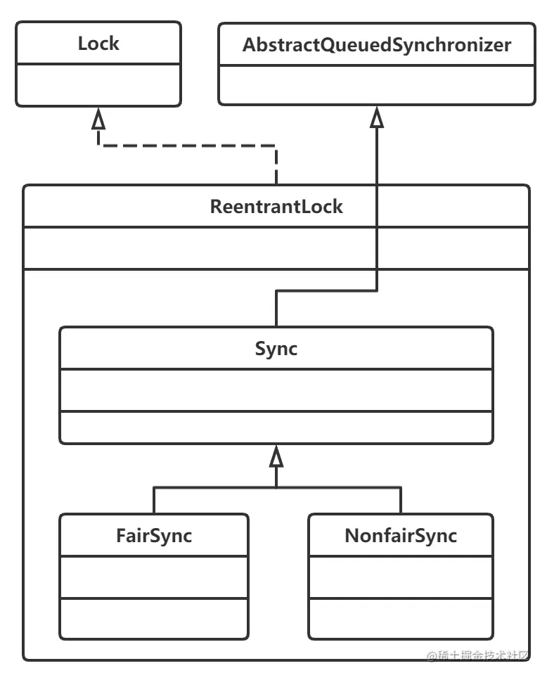 首先ReentrantLock 实现了 Lock 接口,然后有3个内部类,其中Sync内部类继承自AQS,另外的两个内部类继承自Sync,这两个类分别是用来公平锁和非公平锁的。通过Sync重写的方法tryAcquire、tryRelease可以知道,ReentrantLock实现的是AQS的独占模式,也就是独占锁,这个锁是悲观锁。