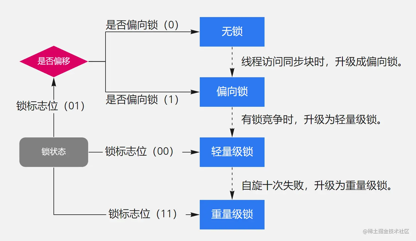 JDK 1.6之前,synchronized 还是一个重量级锁,是一个效率比较低下的锁。但是在JDK 1.6后,JVM为了提高锁的获取与释放效率对synchronized 进行了优化,引入了偏向锁和轻量级锁 ,从此以后锁的状态就有了四种:无锁、偏向锁、轻量级锁、重量级锁。并且四种状态会随着竞争的情况逐渐升级,而且是不可逆的过程,即不可降级,这四种锁的级别由低到高依次是:无锁、偏向锁,轻量级锁,重量级锁。如下图所示: