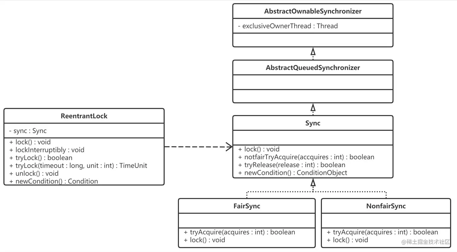 ReentrantLock是基于其内部类FairSync(公平锁)和NonFairSync(非公平锁)实现的,并且它的实现依赖于Java同步器框架AbstractQueuedSynchronizer(AQS),AQS使用一个整形的volatile变量state来维护同步状态,这个volatile变量是实现ReentrantLock的关键。我们来看一下ReentrantLock的类图: