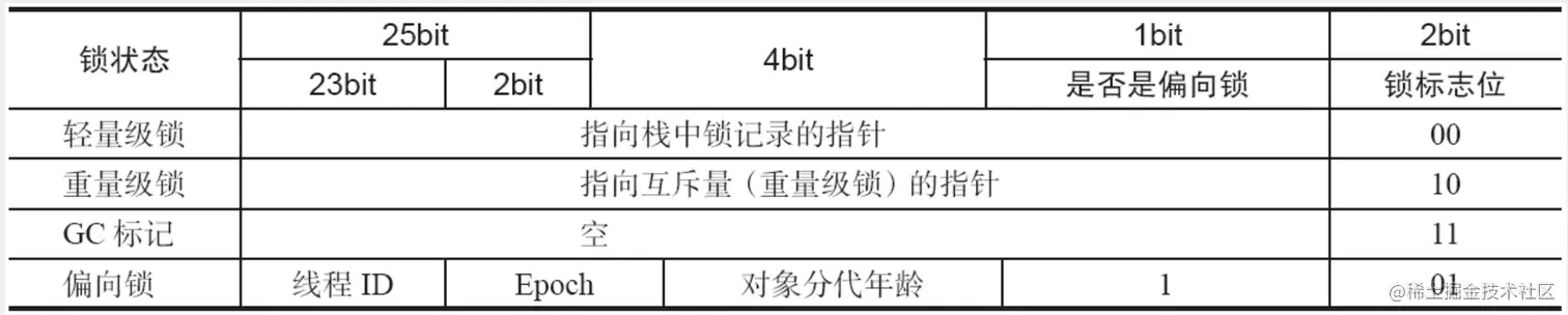 - 偏向锁: 在偏向锁中划分更细,还是开辟 25bit 的空间,其中23bit 用来存放线程ID,2bit 用来存放 Epoch,4bit 存放对象分代年龄,1bit 存放是否偏向锁标识, 0表示无锁,1表示偏向锁,锁的标识位还是01。