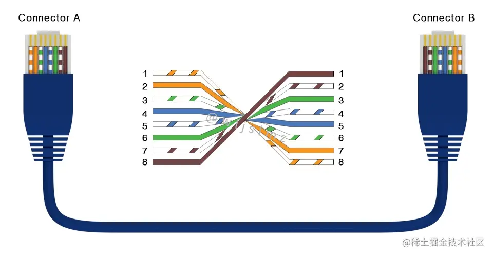 翻转电缆顾名思义,连接器的两端线缆的链接顺序是相反的,连接器 A 的引脚 1 将连接到连接器 B 的引脚 8,连接器 A 的引脚 2 将连接到连接器 B 的引脚 7,依此类推。所以有时候,翻转电缆又被称为:全反电缆。