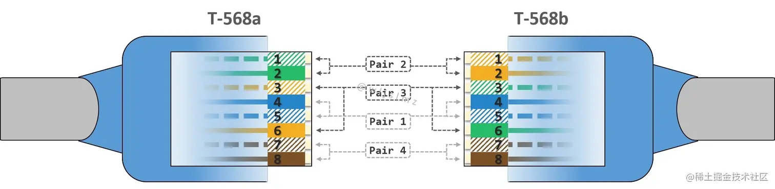 - 交叉线是一种 CAT,一端为 T568A 配置,另一端为 T568B 配置。