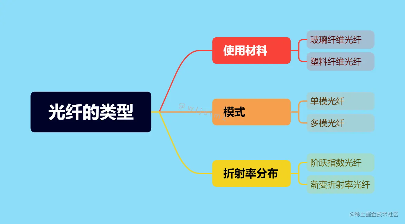 - 光纤:由光学透明的介电介质制成的非常细的中心管,承载着光发射器和接收器,纤芯直径从5um到100um不等。