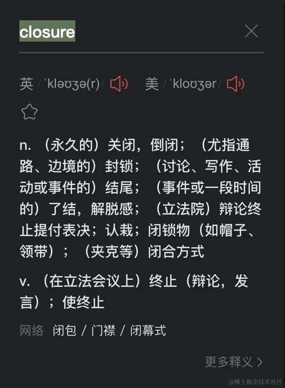 它的含义更多的是闭,而不是包。为什么要提及这一点呢?因为这词语更加准确的翻译应该是闭合性,我们在讨论 JS 的闭包的时候,其实是在讨论 JS 中如何实现函数的闭合性的?