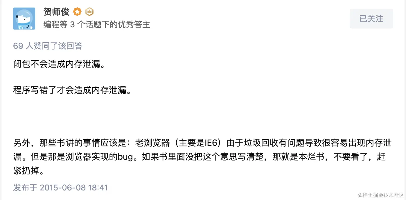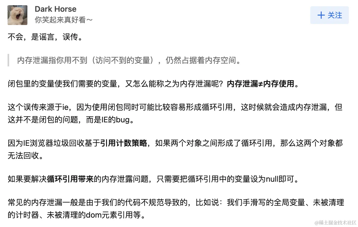 也就是说,对于闭包而言,造成内存泄漏的不是闭包本身,而是IE浏览器。