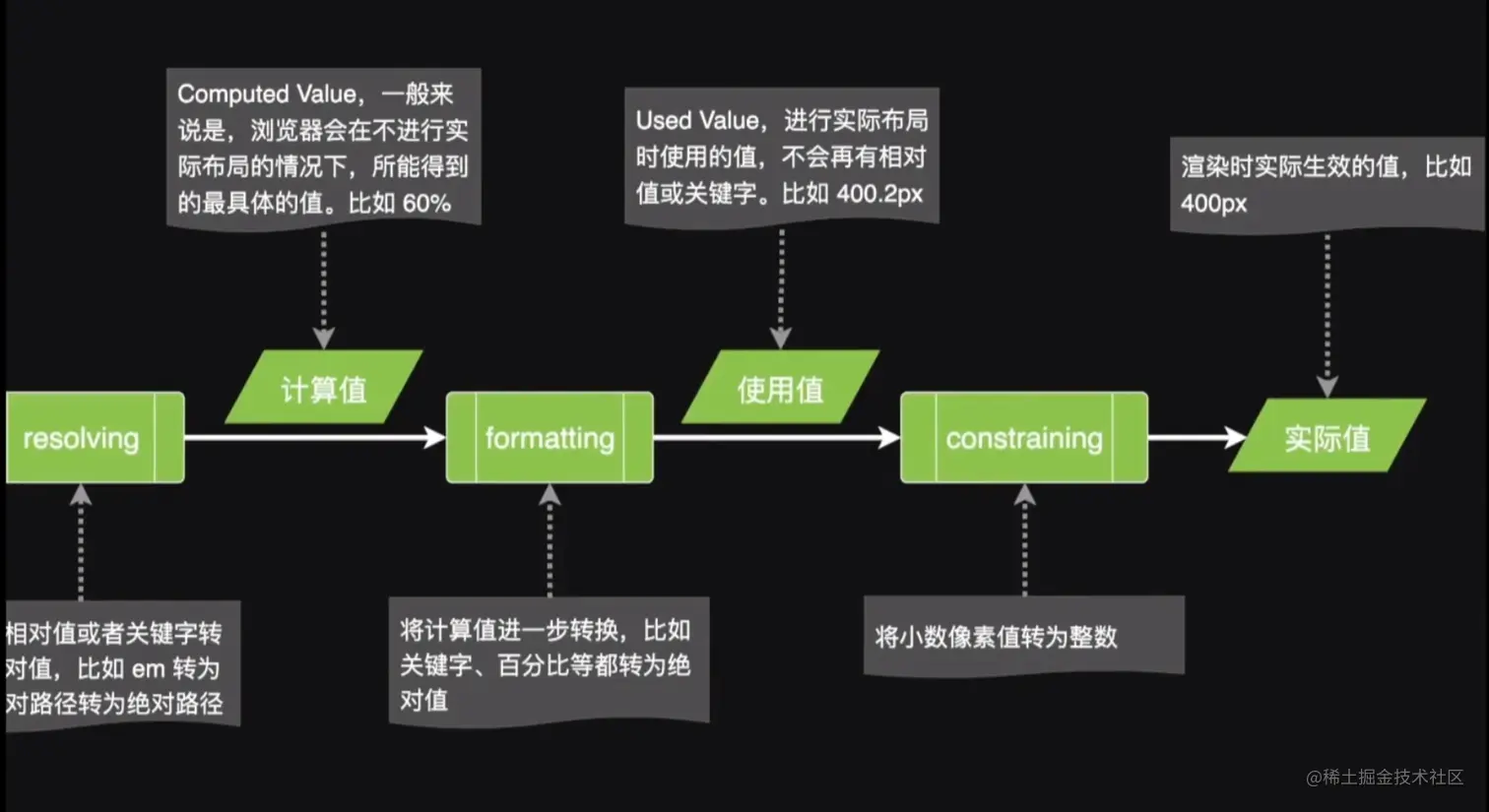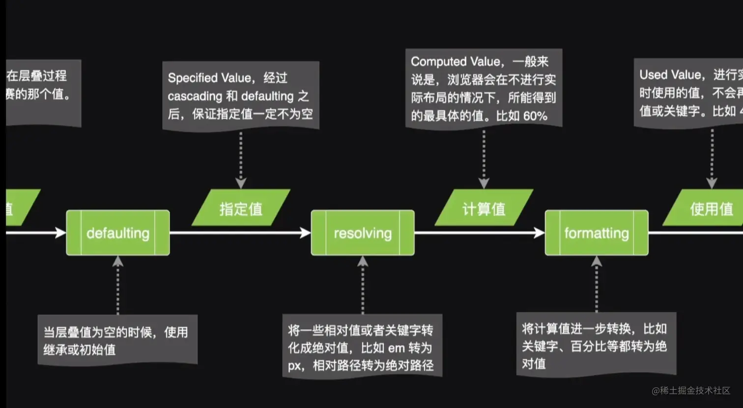 计算值和使用值有区别,浏览器拿到CSS的时候会马上可以计算出一个基本的值是计算值。但是有些时候有些值不能直接计算出来,需要实际值,考虑实际布局渲染的时候根据打开的页面才能计算出来的值。 一般的继承是继承父级的计算值