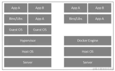从图2-1可以看出,虚拟机和容器最大的区别在于没有Guest OS(客户虚拟机)这一层。