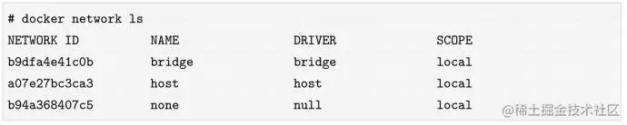 在安装完Docker之后,Docker Daemon会在宿主机上自动创建三个网络,分别是bridge网络、host网络和none网络,可以使用docker network ls命令查看,如下所示: