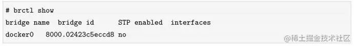 bridge模式是Docker默认的网络模式。docker0网桥是普通的Linux网桥,而非OVS网桥,因此我们通过brctl命令查看该网桥信息: