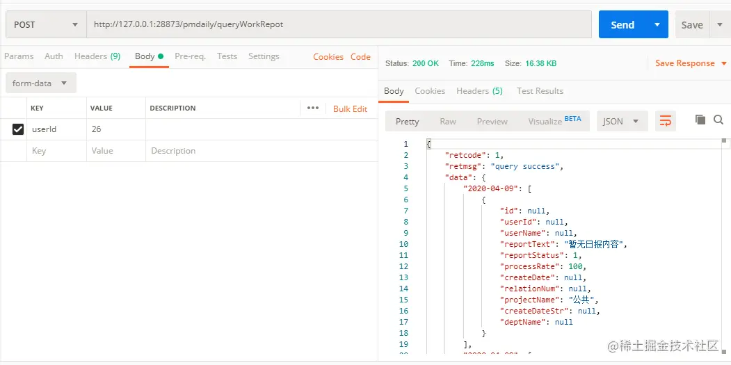 从上图可以看出基本上就是将接口的信息填入就可以测试,在我这边我就用项目管理项目中的一个接口作为例子