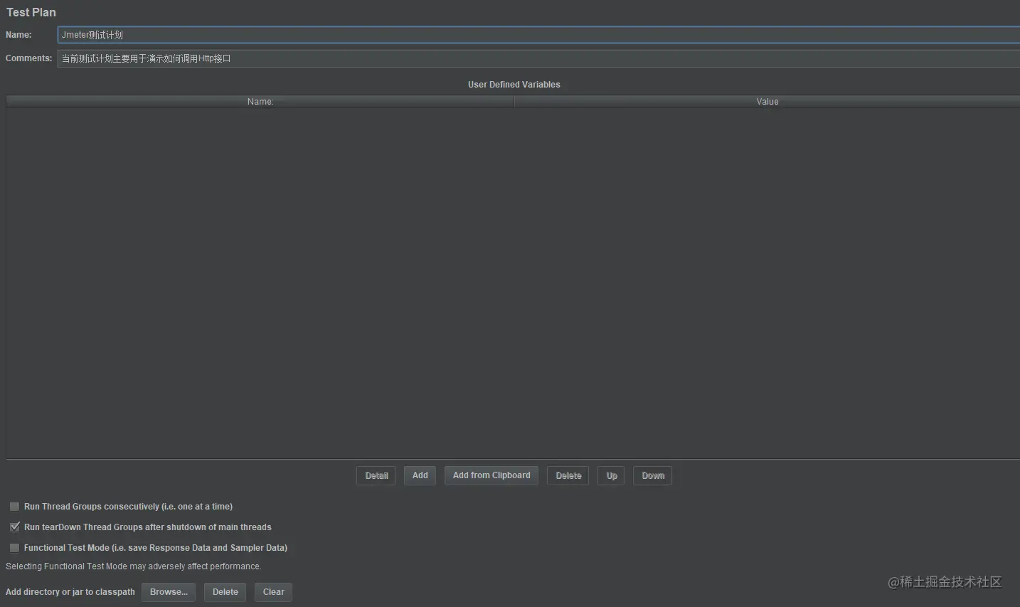 一般来说作为一个非专业的测试人员用于测试的情况下只填上Name和Comments就可以了。但是我们可以设置用户变量到User Defined Variables中以便后面的测试线程中使用。在这里我就先不加用户变量了,之后在线程组中也是可以添加的。
