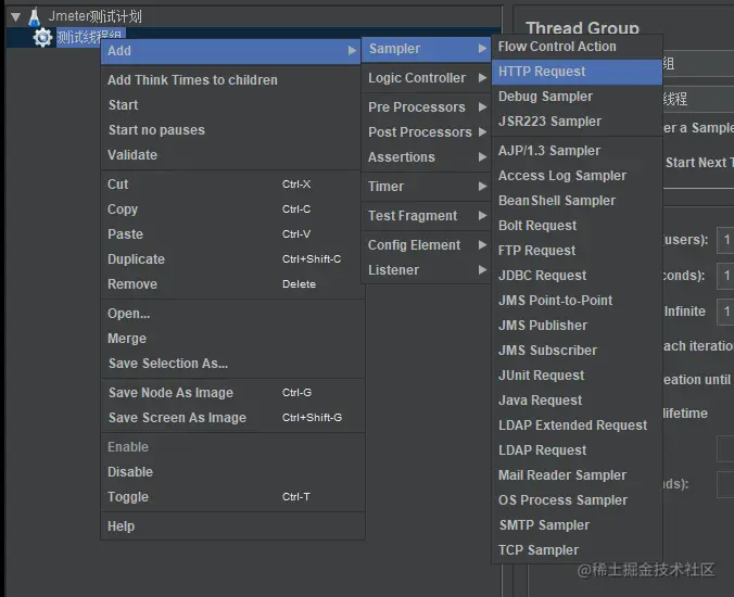 同理通过鼠标右键可以生成Http实例,也就是我们的Http接口测试实例。其实通过上图可以看出除了Http接口之外还有很多类型的请求都是可以通过JMeter进行测试的,只是我们目前用得最多的就是http接口而已。