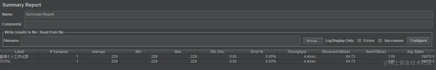 Summary Report:可以看到该接口的传输时间也就是我们压测时比较重要的几个网络传输指标,通过该指标我们可以对程序进行调优