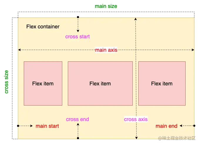 - cross-start & cross-end: 分别表示交叉轴的开始和结束。子元素在交叉轴的排布从cross-start开始到cross-end。