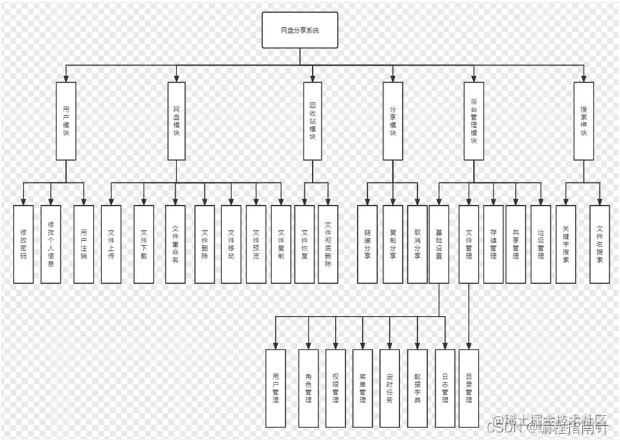 本系统设计了两种用户角色:普通用户和系统管理员。普通用户可以使用系统提供的网盘并对自己网盘中的资源文件进行管理,上传以及下载删除等,使用分享功能功能,以及在系统中查看查找上传的指定的系统文件。系统管理员除了能对普通用户的功能编辑管理等功能之外,还有进入后台管理模块的权限,可以对平台中的用户以及资源文件进行管理,还有新增、编辑和删除等众多模块关联的功能,对系统中用户文件进行处理的功能。该系统的功能模块图如图3-1所示。
