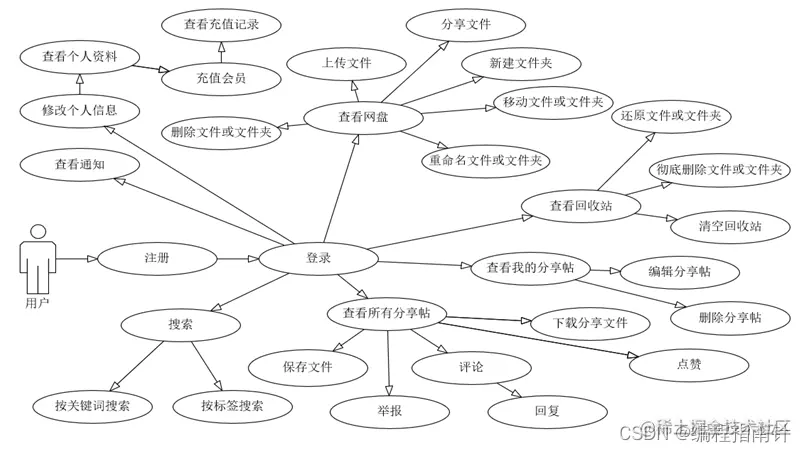 普通用户可以使用系统的基础功能,如个人信息管理,上传下载文件,管理网盘文件,管理回收站文件,搜索文件,共享文件,用户功能用例图如图3-2所示。