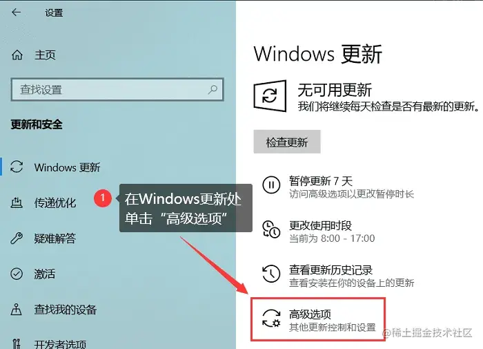 步骤2: 在打开的界面右侧选择【高级选项】。之后把【更新项目】里面的项目全部关闭,或者是选择下方的【暂停更新】。
