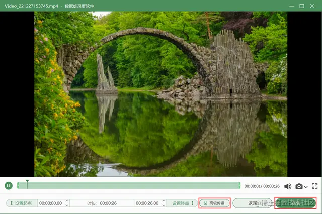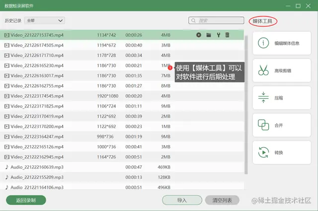 **步骤4.**录制结束之后,在预览页面可以对文件进行剪辑(高级剪辑),然后点击【完成】按钮,视频会自动保存到电脑上。然后进入【录制历史】页面,在此页面,您可以使用【媒体工具】对文件进行后期(压缩、合并、转换)处理。