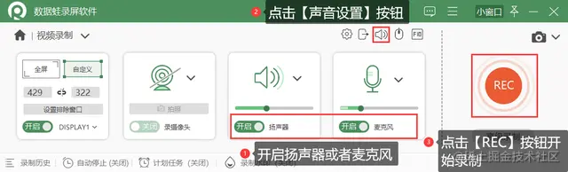 **步骤3.**选择需要录制模式,比如这里选择【视频录制】模式。来到【视频录制】页面,如果您要录制电脑系统的声音,可以开启扬声器;如果您要录制自己讲话的声音,可以开启麦克风。软件还提供了“麦克风降噪、增强”的功能,为了更好地录制声音,您可以点击页面右上角的【声音设置】按钮进行设置。接着设置录制的范围,点击【REC】按钮进行录制。