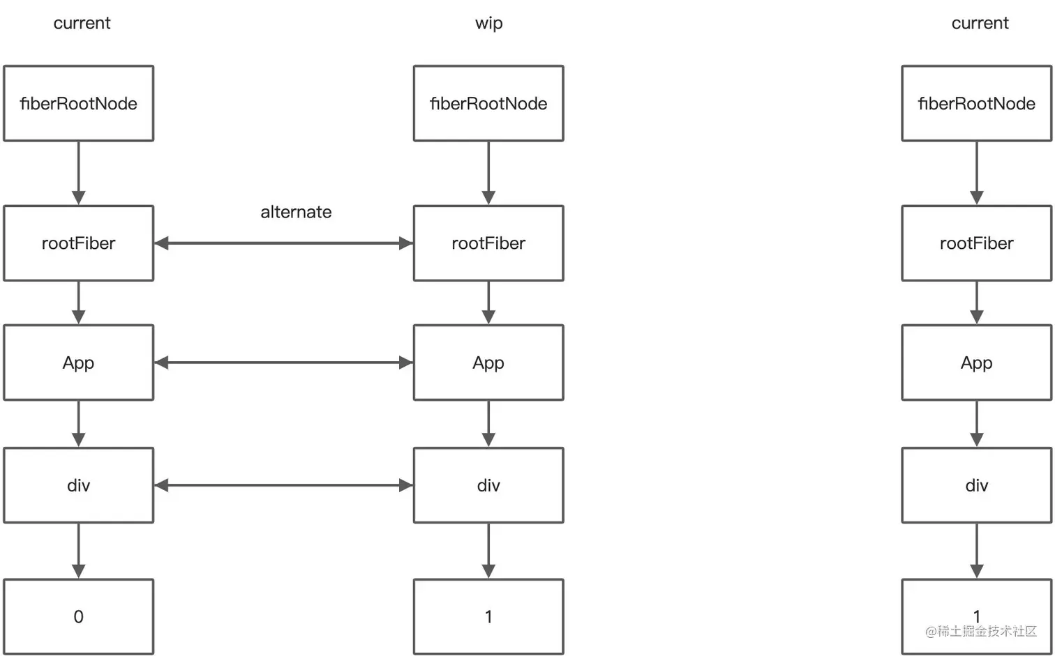 - child:指向第一个子 fiber,若没有任何子 fiber 则为 null